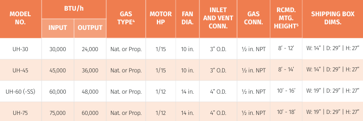 SKU: N/AThe UH Series line of Gas-fired, tubular exchanger, induced draft, hot air heaters are now available for use in commercial, industrial, agricultural and residential applications. This line of heaters offers a low-profile design with a durable, powder-coated black enamel exterior and stainless-steel louvers for an exceptional aesthetic appeal, and a swept-wing impeller with finger-proof fan guards for low noise operation.